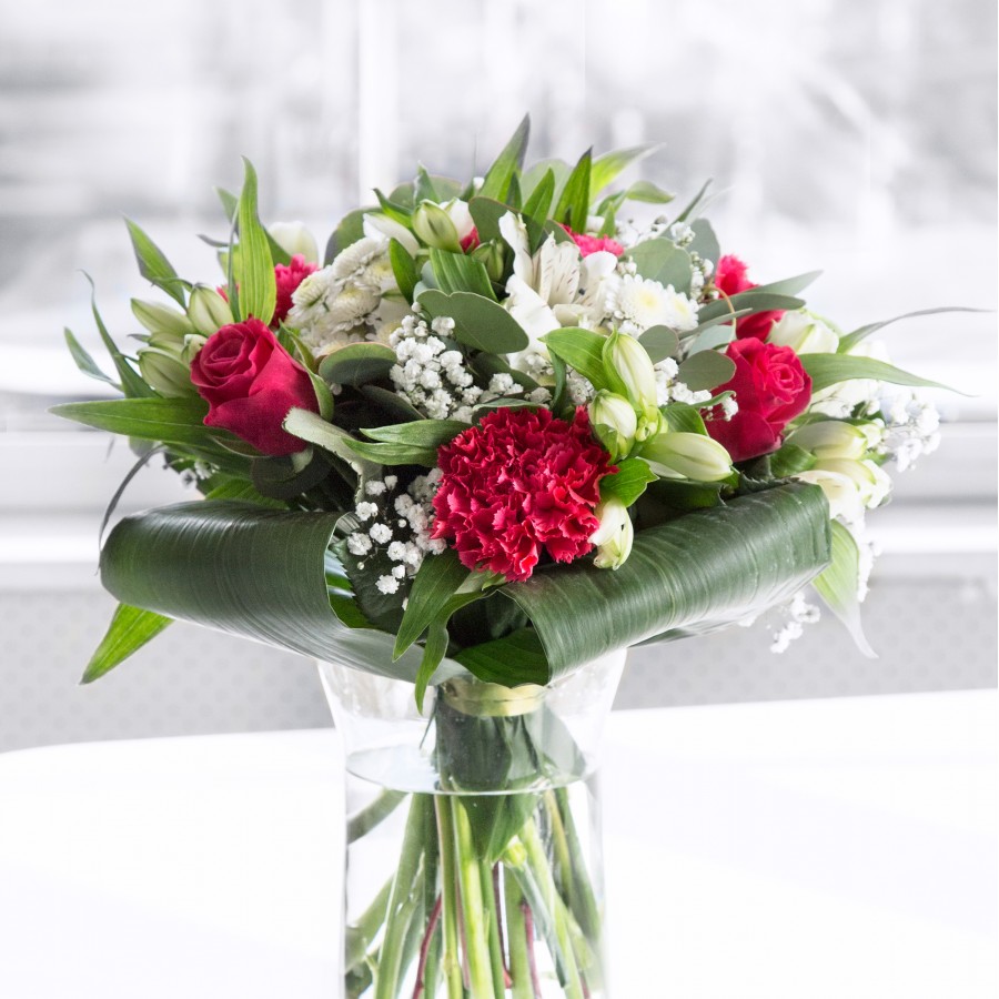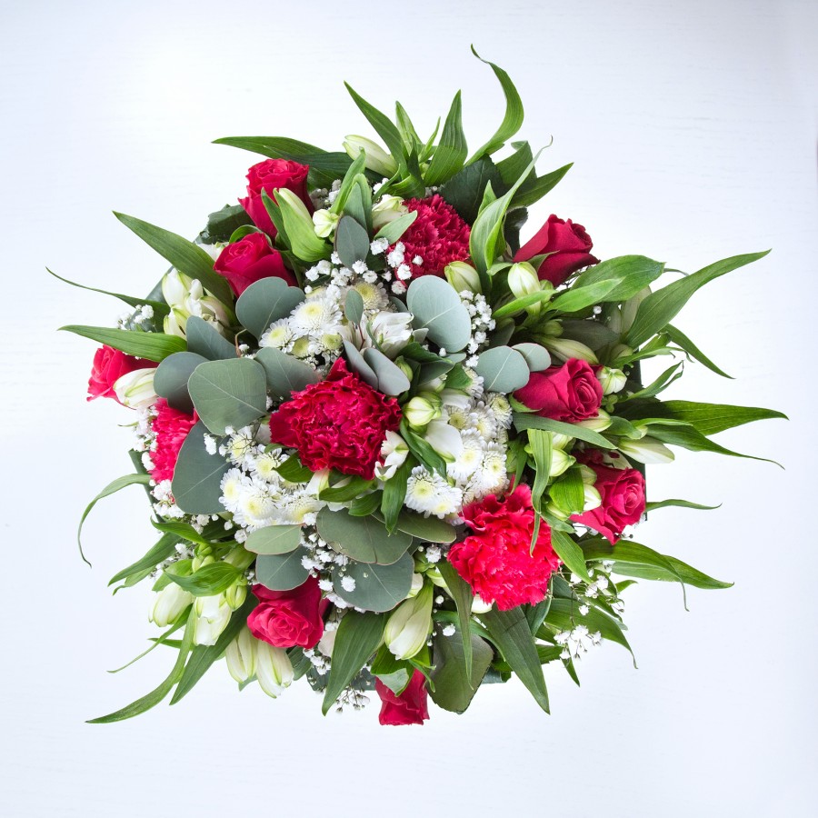 Discover the stunning combination of red roses, white chrysanthemums, and carnations in our premium bouquet. Each flower is meticulously chosen for its freshness and beauty, ensuring a breathtaking display that captivates the eye.