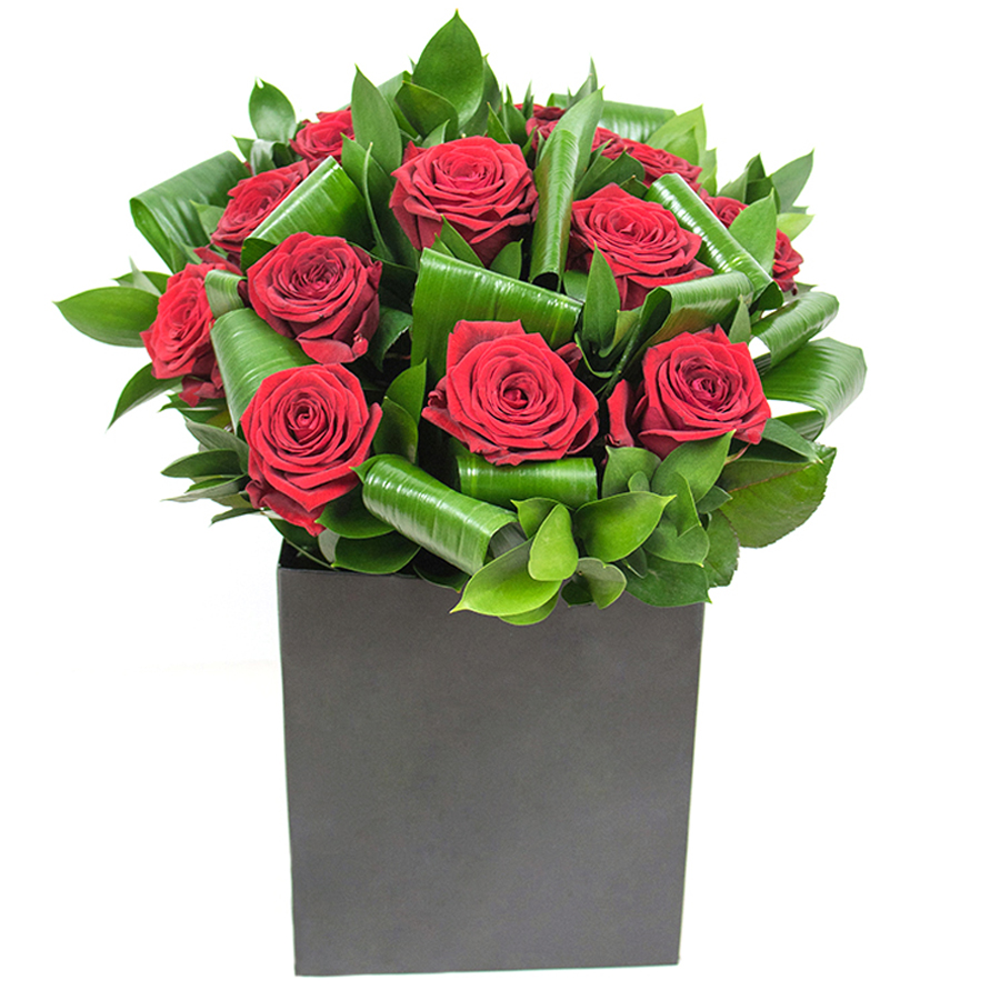 Delight in the beauty of our lovely bouquet featuring vibrant red roses, luxuriant aspidistra leaves, and elegant ruscus. This unique arrangement adds a touch of sophistication and charm to any home.
